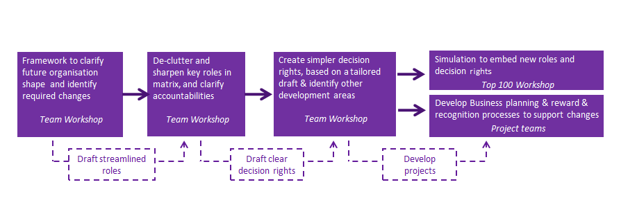 Our client was a large multinational services business which had experienced exceptionally fast growth but was in danger of stalling as the top 50 leaders, scattered around the world, argued and misbehaved over day-to-day business. After initial discussion it became clear that the clients key challenge was an outdated matrix structure, with lack of role definition and clarity on decision rights, combined with senior leaders focusing solely on their own business rather than success for all.